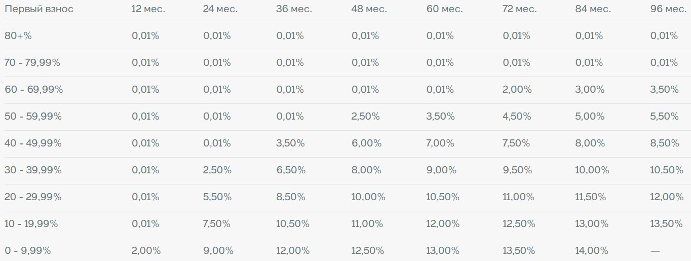 - При сроке 60 месяцев: ставка 0,01% годовых при первоначальном взносе от 70%.