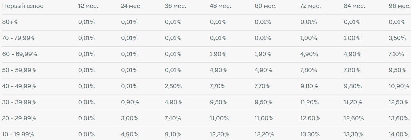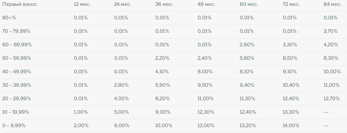 Диапазон Полной стоимости кредита в % годовых составляет от 0,005% до 14,461%. % ставка составляет от 0,010% до 14,000%, на диапазонах первоначального взноса от 10,000% до 90,000% включительно от стоимости автомобиля, при сроке кредита от 12 до 96 мес. и определяется индивидуально.